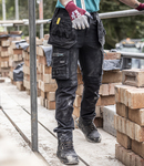 100% polyester. Made from at least 30% recycled polyester. Woven four-way stretch fabric. Water repellent finish. Part elasticated waistband with belt loops. Zip fly with button over. Detachable holster pockets with slide system for optional use. Two side pockets. Two rear pockets. Side leg multi-use cargo pockets with contrast zip pulls. Ripstop stretch fabric to outer thigh, lower leg and seat panels. Cordura® top loading knee pad pockets. Reinforced seams with triple stitching. Branded.