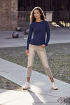 Our long sleeved T-shirt in a closer fit, neck tape at back, elastane in neck rib. Men’s is round knitted and ladies has side seams.
